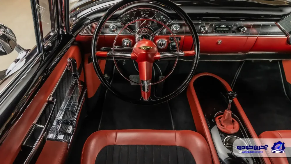 فضای داخلی این شورولت بل ایر ۱۹۵۶ به خوبی DNA و ظاهر دهه پنجاه را حفظ کرده است. صندلیها با روکش چرمی مشکی و آجری در کنار داشبورد مشکیرنگ، هماهنگی کاملی با نمای بیرونی دارند. غربیلک فرمان جدید با طراحی کارخانهای، روبروی نشاندهندههایی با ظاهر کلاسیک قرار گرفته است.
