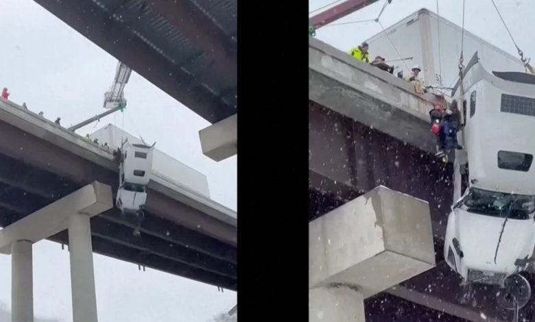 مجله اینترنتی مفید – کامیونی در ایالت ویرجینای آمریکا به دلیل لغزندگی جاده از مسیر منحرف شد و کابین آن از یک پل آویزان ماند. نیروهای امدادی موفق شدند راننده را بهموقع نجات دهند.