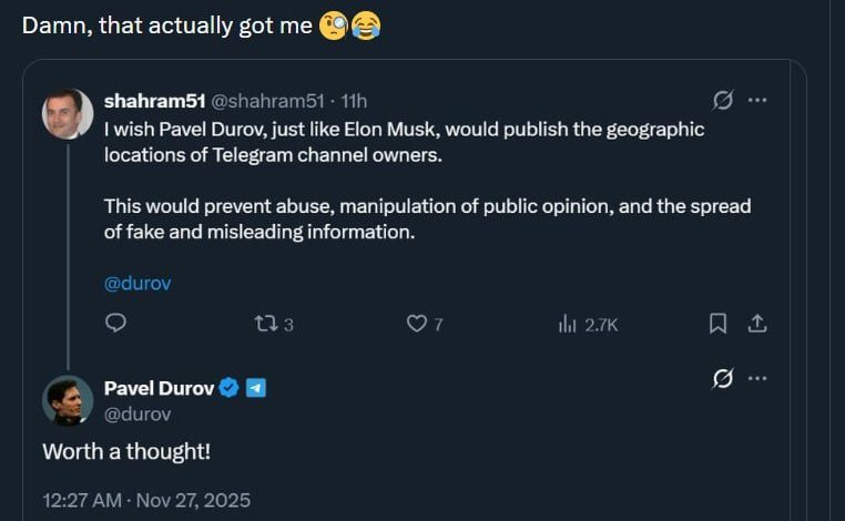به مجله اینترنتی مفید؛ ماجرای آشکارسازی موقعیت مکانی کانالهای تلگرامی تکذیب شد. پاول دوروف در توئیتی اعلام کرد که این اسکرین شات فیک است و نوشت: شوخی جالبی بود!