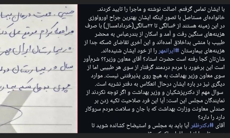 روز گذشته مدیرمسئول نشریه «طبیب» با افشای نامه ای که عنوان می کرد دستخط مادر یک بیمار است، در پست مجازی خود، از دریافت زیر میزی توسط معاون وزیر بهداشت برای یک عمل جراحی خبر داد.