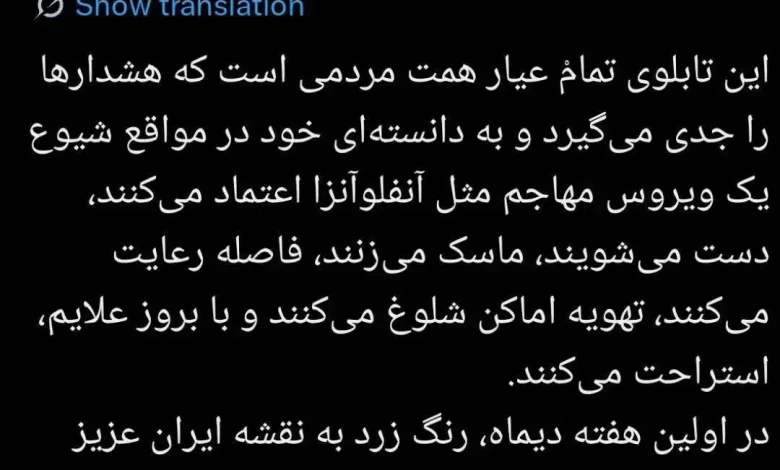 این تابلوی تمامْ عیار همت مردمی است که هشدارها را جدی میگیرند و به دانستهای خود در مواقع شیوع یک ویروس مهاجم مثل آنفلوآنزا اعتماد میکنند، دست میشویند، ماسک میزنند، فاصله رعایت میکنند، با بروز علایم، استراحت میکنند.