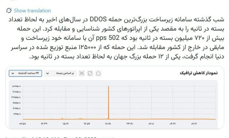 او با انتشار پستی در ایکس نوشت: شب گذشته سامانه زیرساخت بزرگترین حمله DDOS در سالهای اخیر به لحاظ تعداد بسته در ثانیه را به مقصد یکی از اپراتورهای کشور شناسایی و مقابله کرد. این حمله بیش از ۷۲۰ میلیون بسته در ثانیه بود که 502 pps آن با سامانه خود زیرساخت و مابقی در خارج از کشور مقابله شد. این حمله که از ۱۲۵۰۰۰ منبع توزیع شده در سراسر دنیا انجام گرفت، یکی از ۱۲ حمله بزرگ جهان به لحاظ تعداد بسته در ثانیه بود.