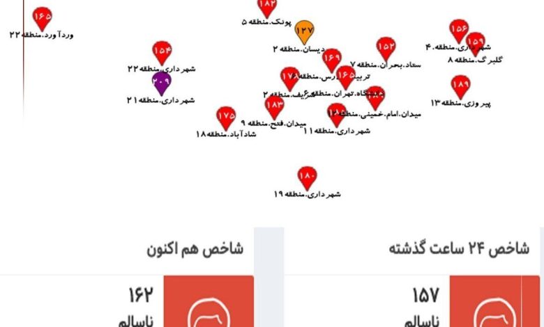 شاخص آلودگی هوای شهر تهران با شاخص ۱۶۲ در وضعیت قرمز و خطرناک برای همه افراد جامعه قرار دارد.