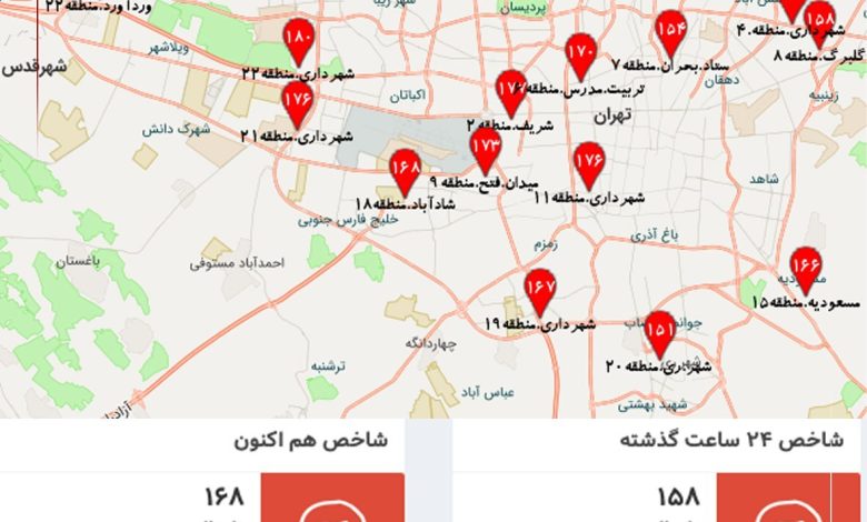 هوای شهر تهران هماکنون باوجود بارش باران در برخی از نقاط شهر با شاخص ۱۶۸ در وضعیت قرمز و ناسالم قرار دارد.