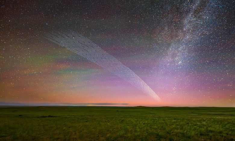 به گزارش مجله اینترنتی مفید، آنچه در این عکس میبینید، دنباله بهجامانده از یک دنبالهدار نیست، بلکه یک توالی تایملپس هوشمندانه از گروهی از ماهوارههاست که در ماه ژوئن در مدار زمین میچرخیدند.