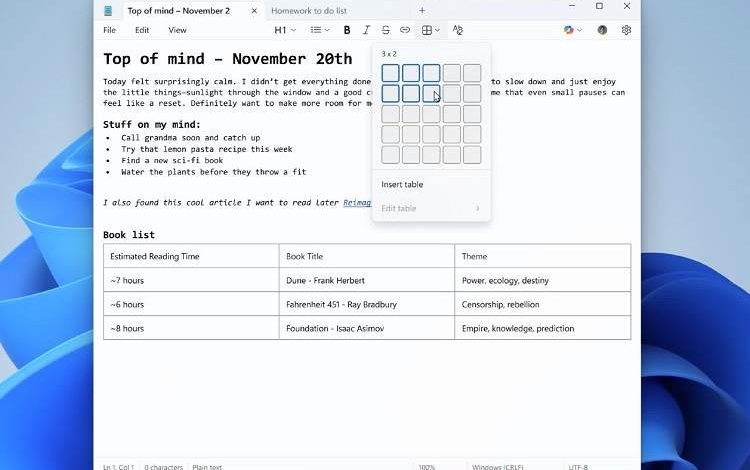 ویژگی جدید ویندوز ۱۱: درج جدول در Notepad ممکن شد