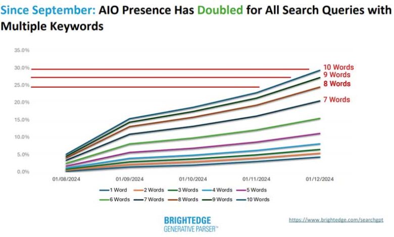 عبارات کلمات کلیدی با کمتر از چهار کلمه همچنان نشان دهنده افزایش فزاینده AIO است اما رشد در کلمات کلیدی دقیق تر طولانی تر به طور قابل توجهی سریعتر در حال رشد است.